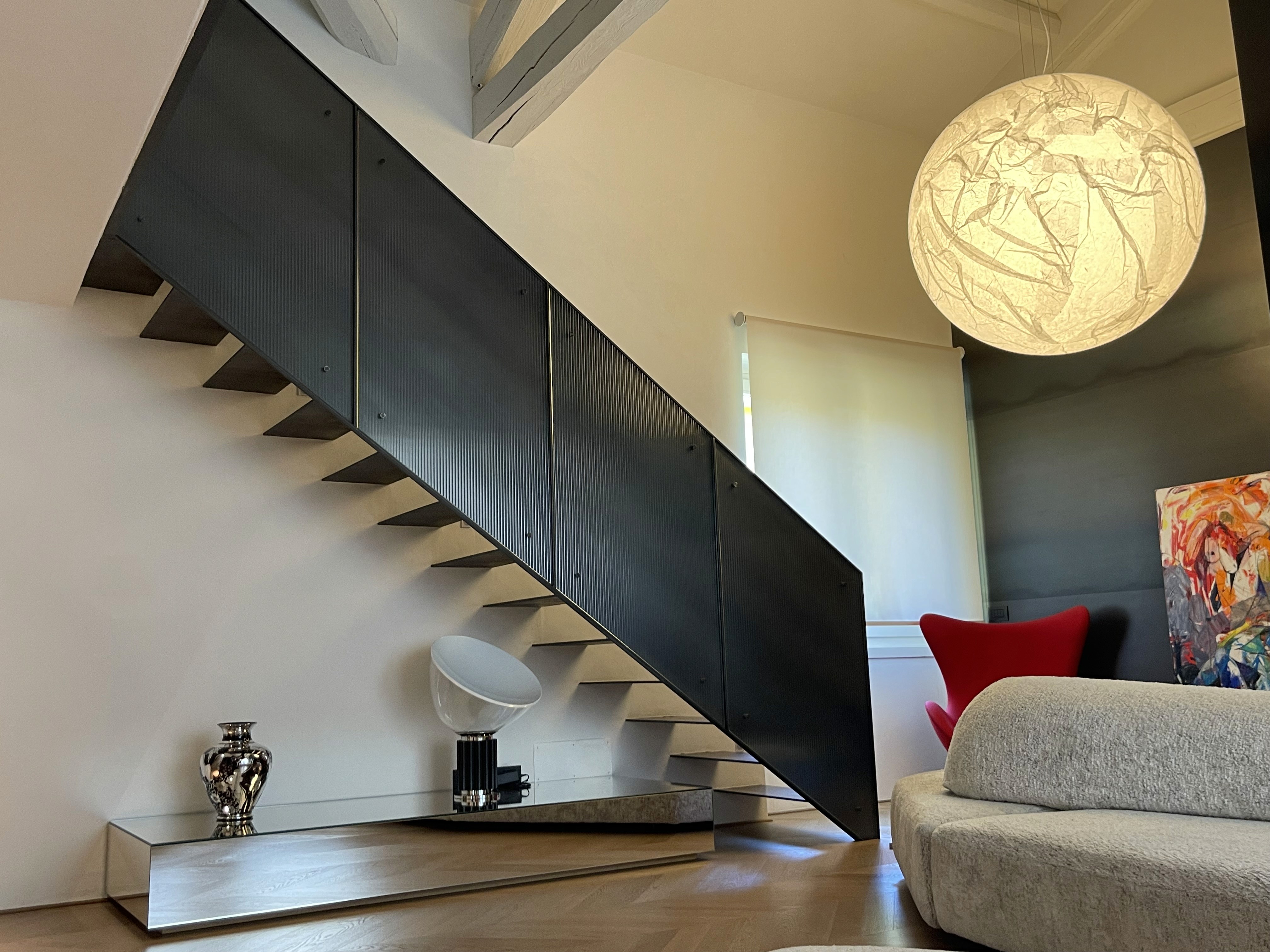 The selected finish is a powder coating, applied with an “orange peel” texture. This choice was made to allow the client, while ascending the staircase, to experience the material through touch, maintaining a direct and authentic tactile connection.
