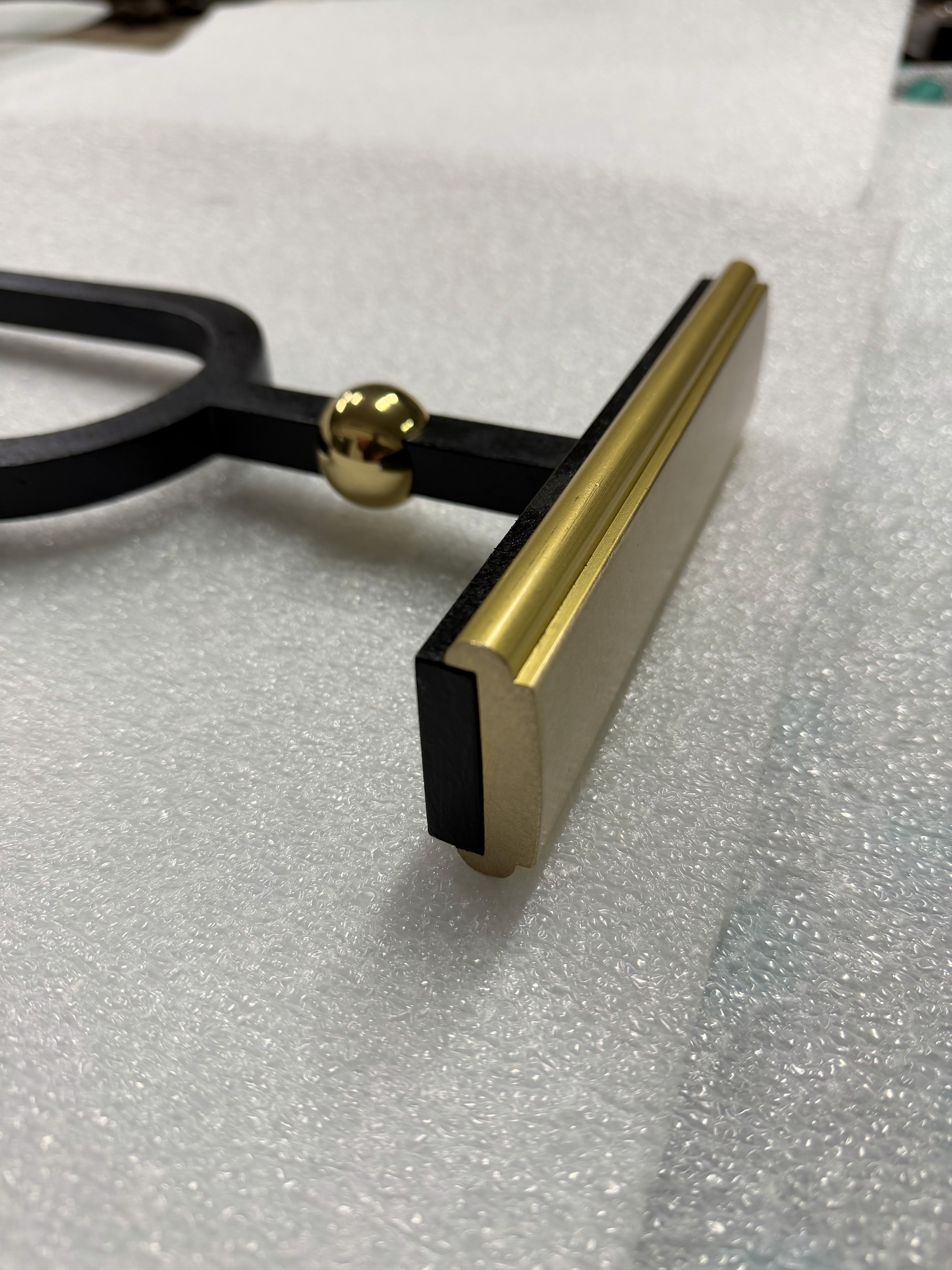 To enhance this detail, a dual finish was selected: the spheres were left in polished brass, while the handrail features a satin finish. The contrast between the two surfaces creates a refined and subtle balance, enriching the overall composition without overwhelming it.