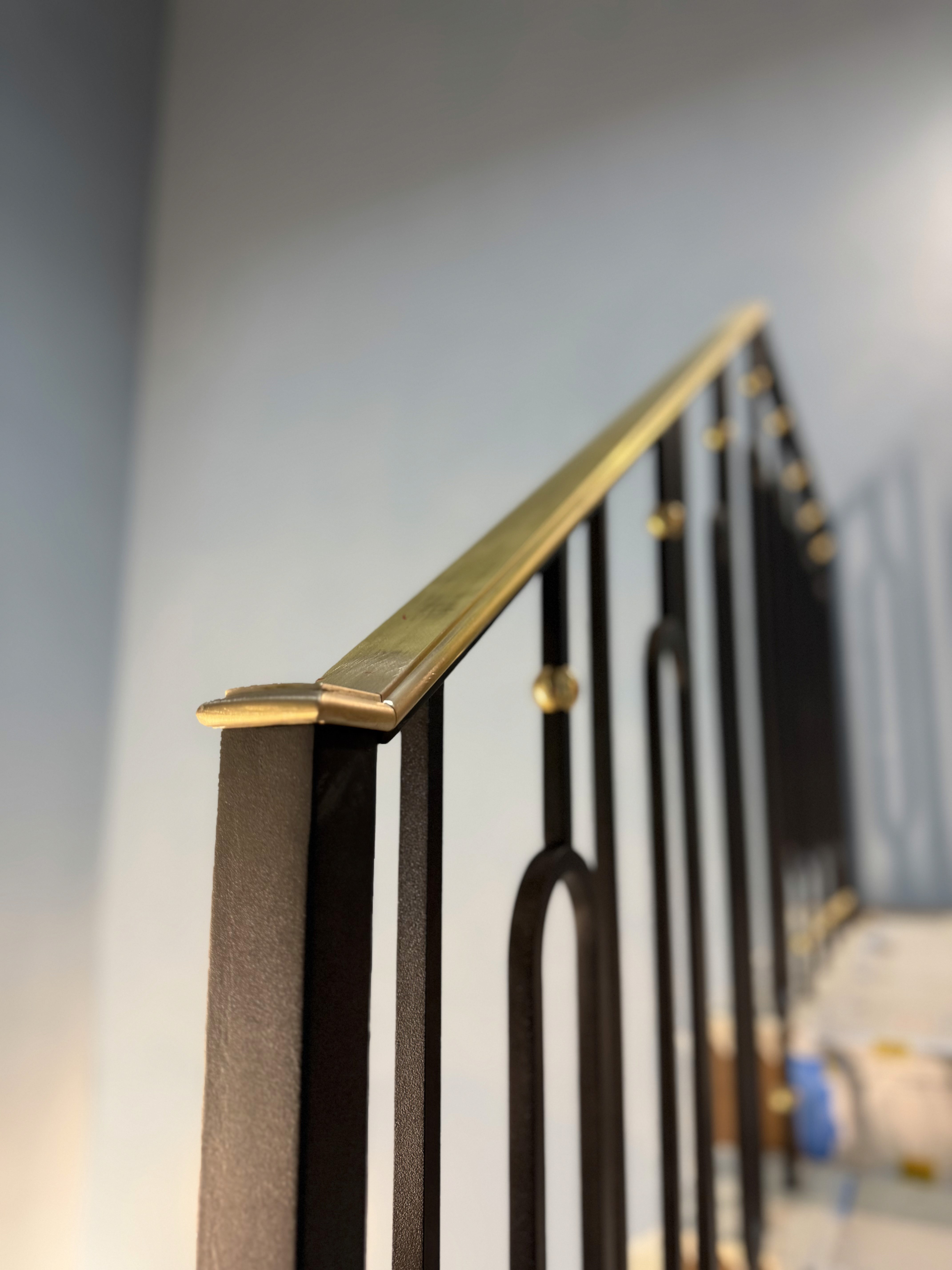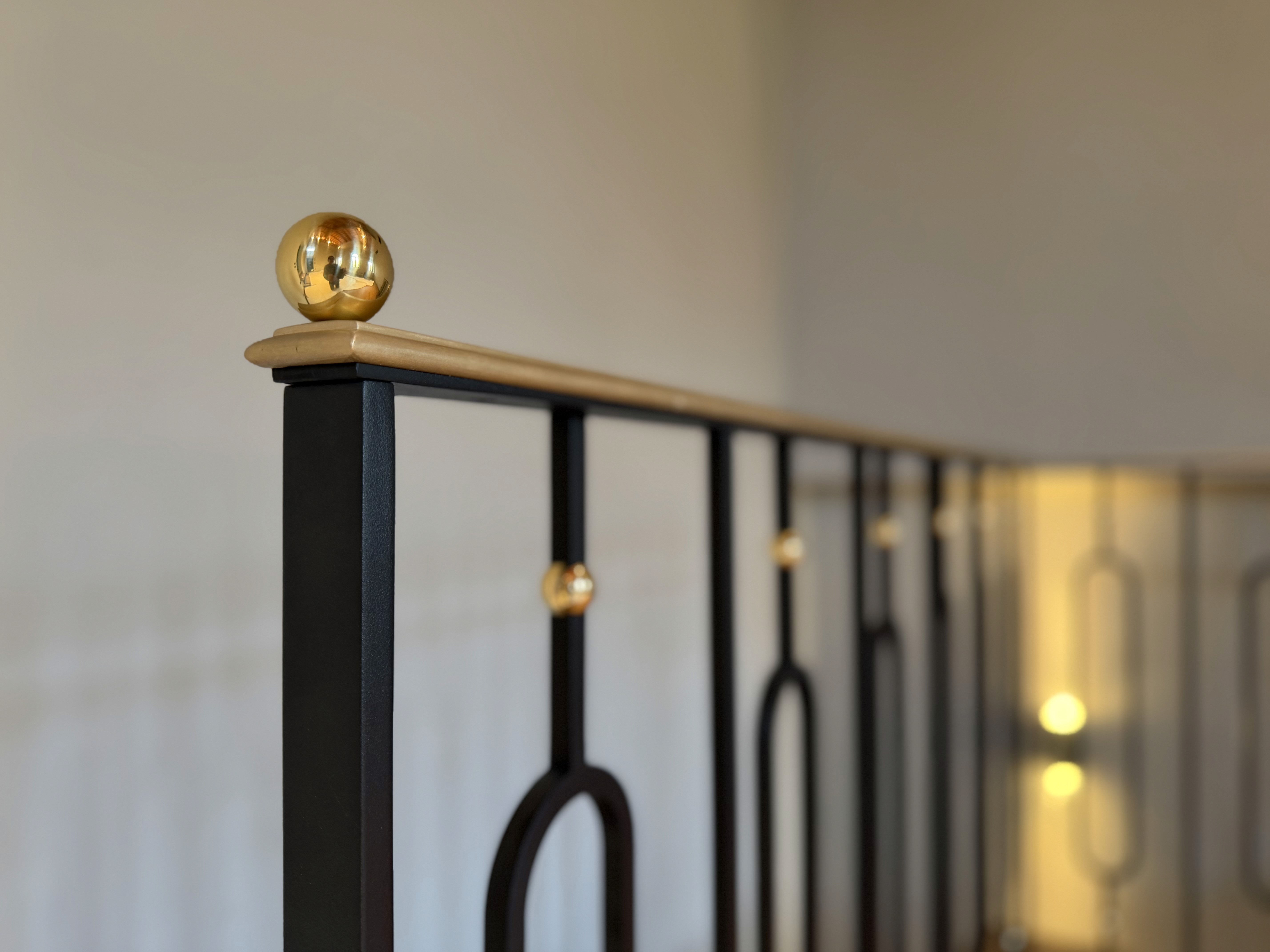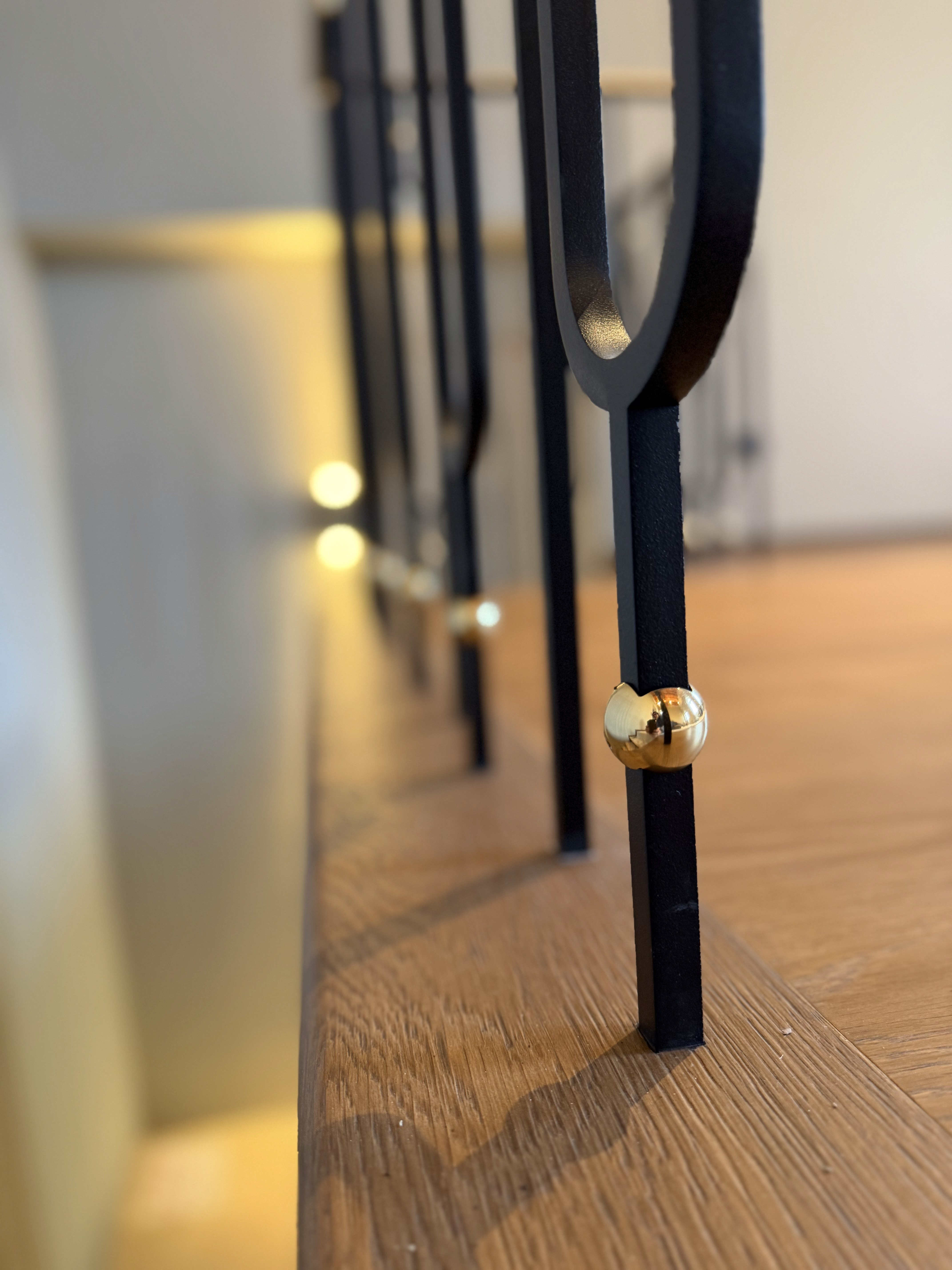 n the final stage, the newel points were further emphasized through the addition of a slightly larger sphere, positioned above the brass handrail. This choice visually reinforces the main structural anchors of the balustrade, giving them greater presence and definition.