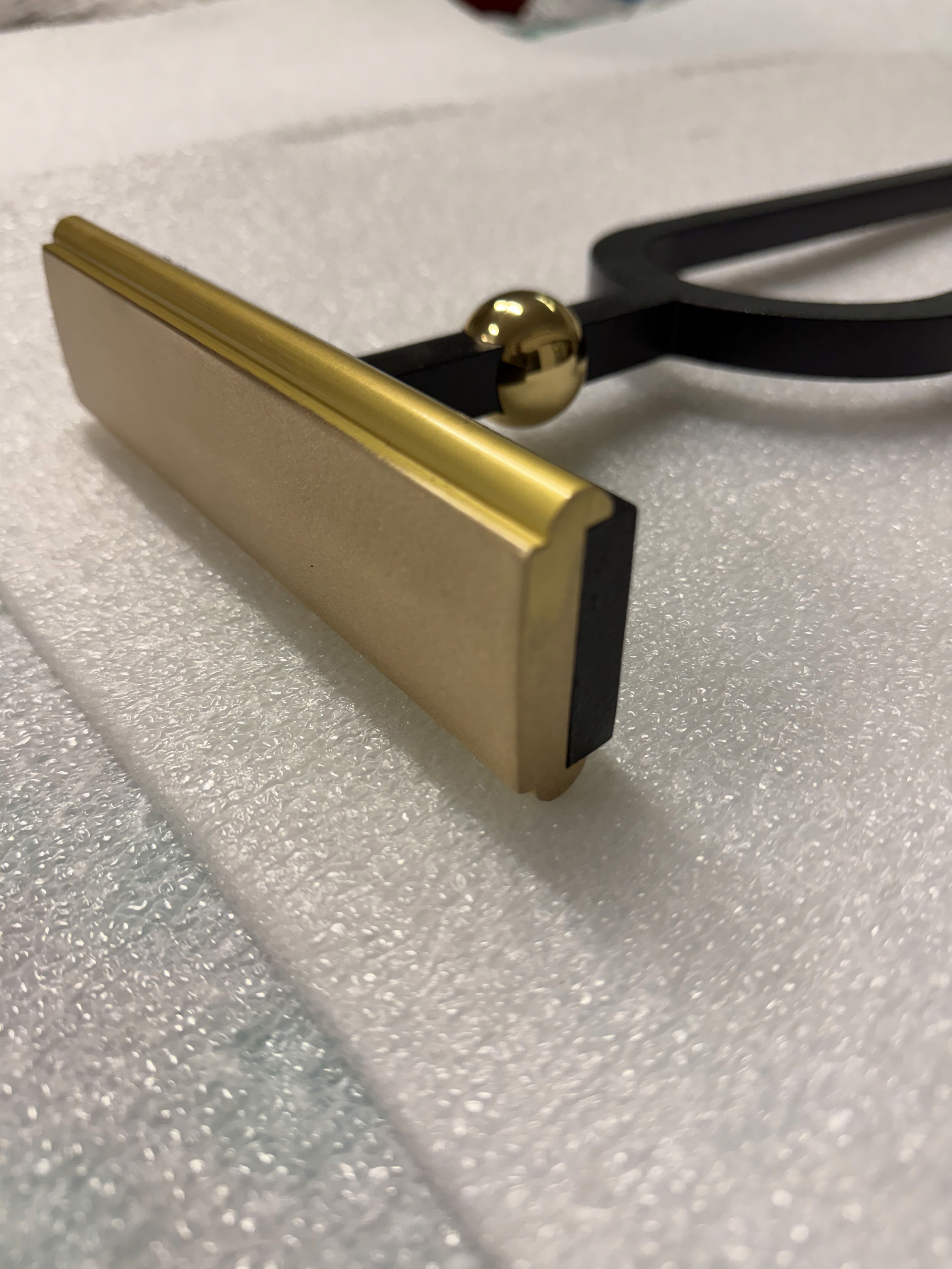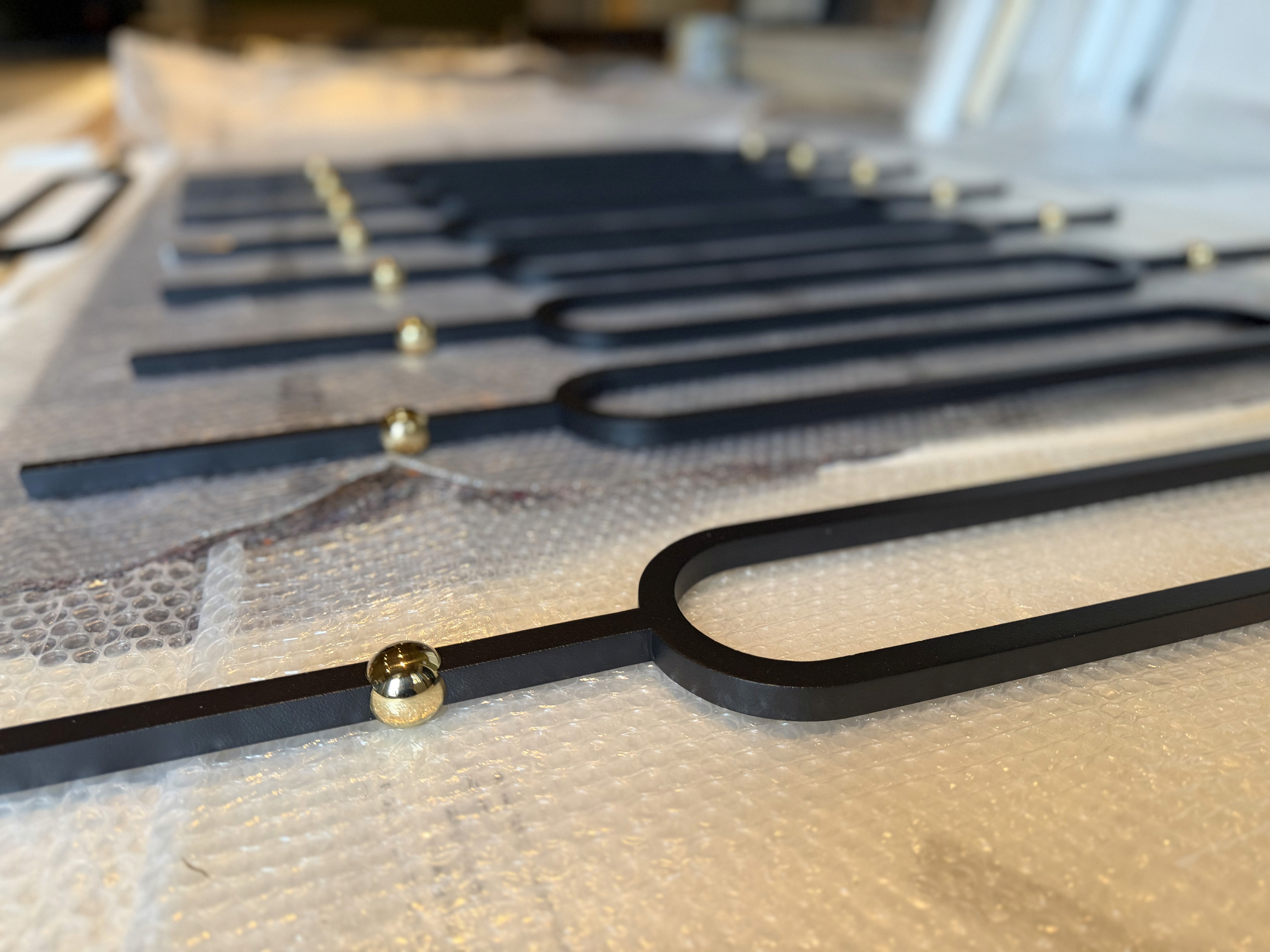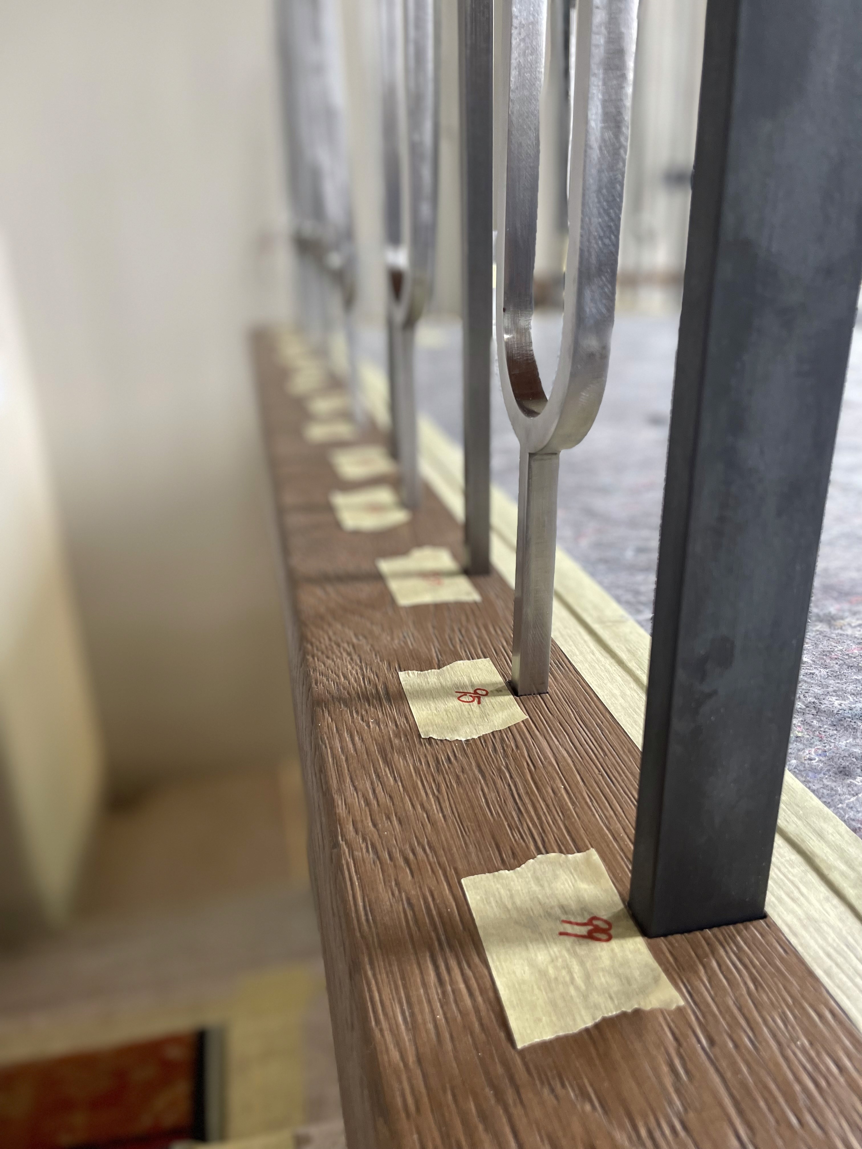 n the final stage, the newel points were further emphasized through the addition of a slightly larger sphere, positioned above the brass handrail. This choice visually reinforces the main structural anchors of the balustrade, giving them greater presence and definition.