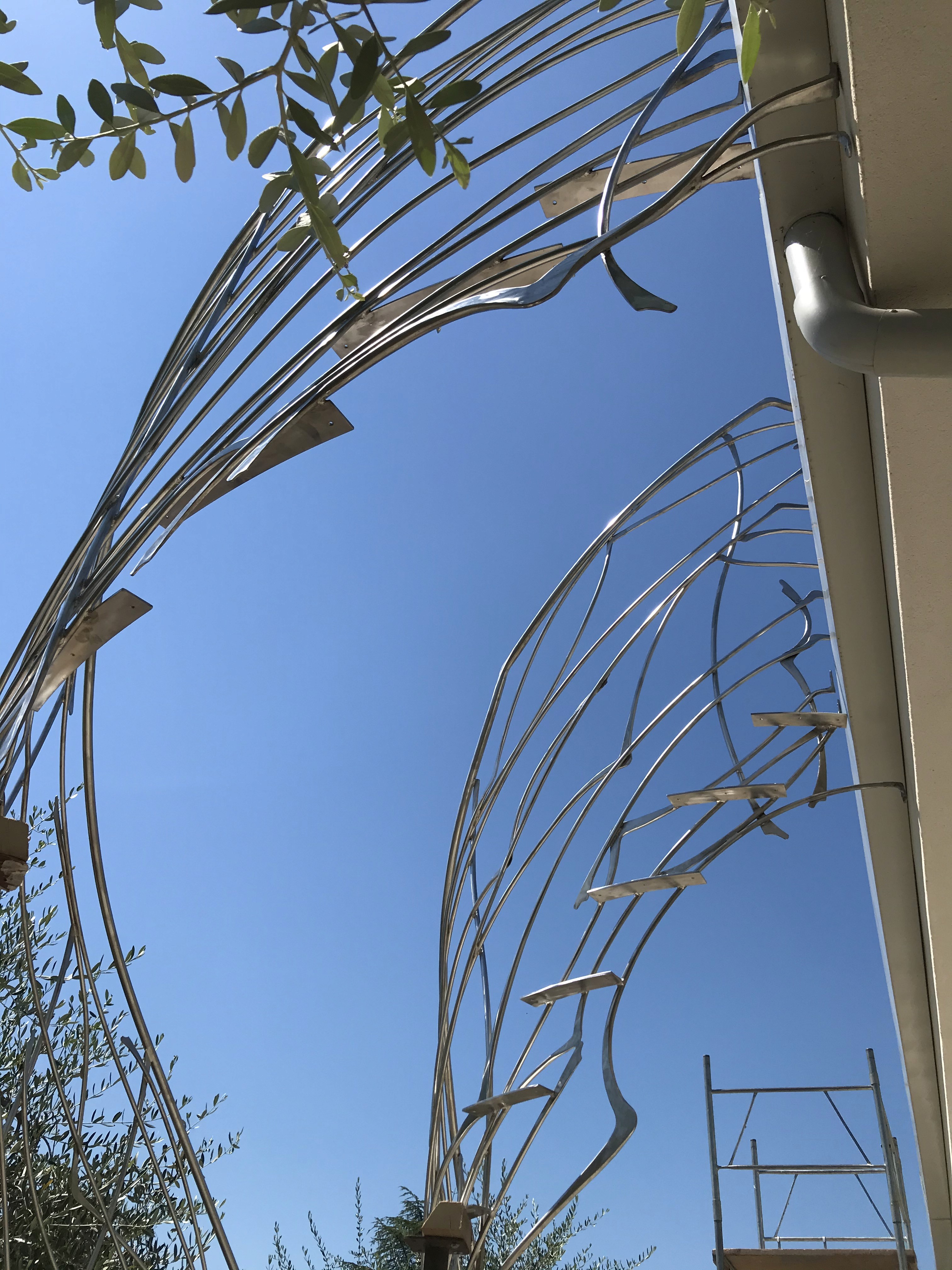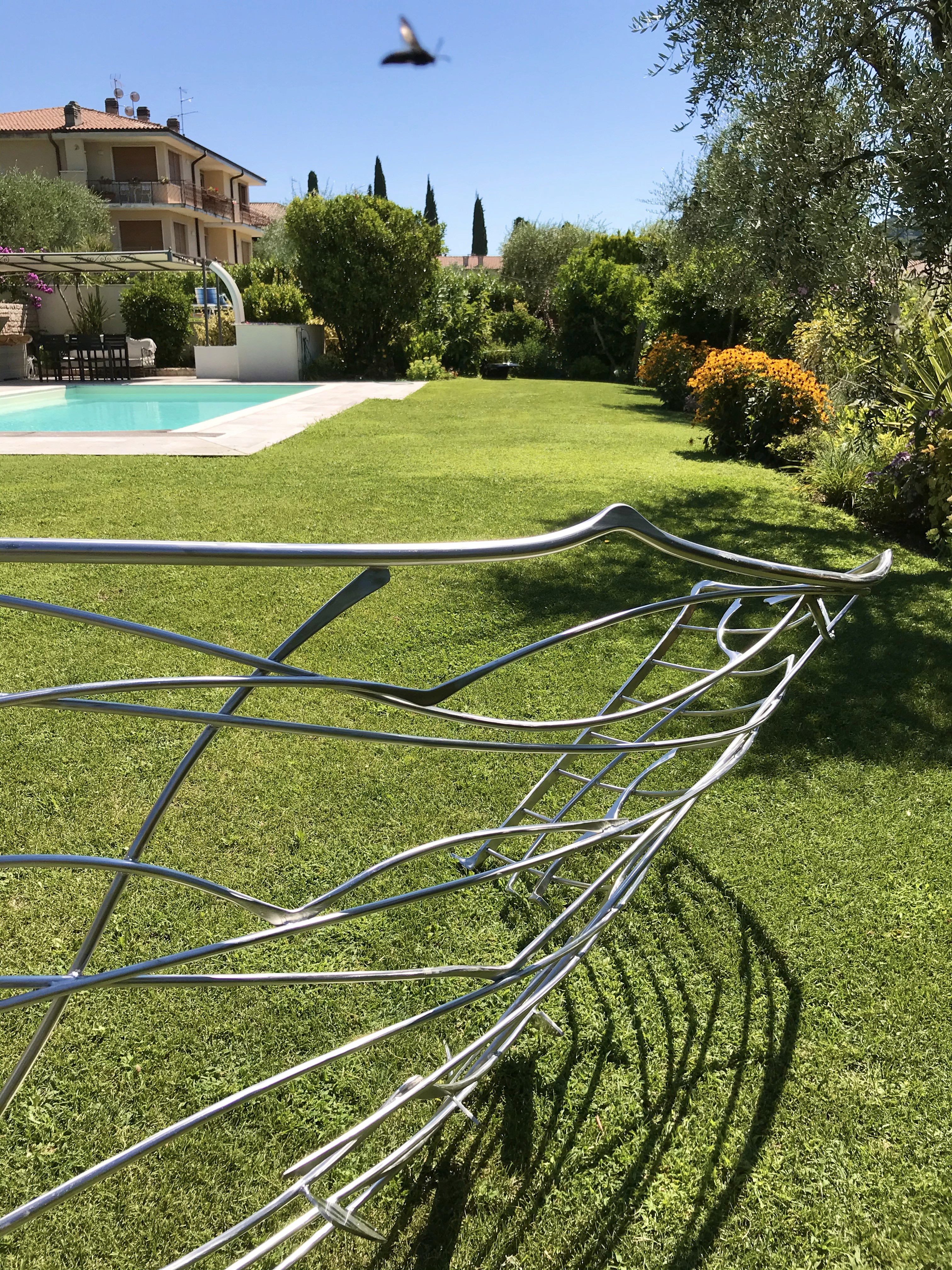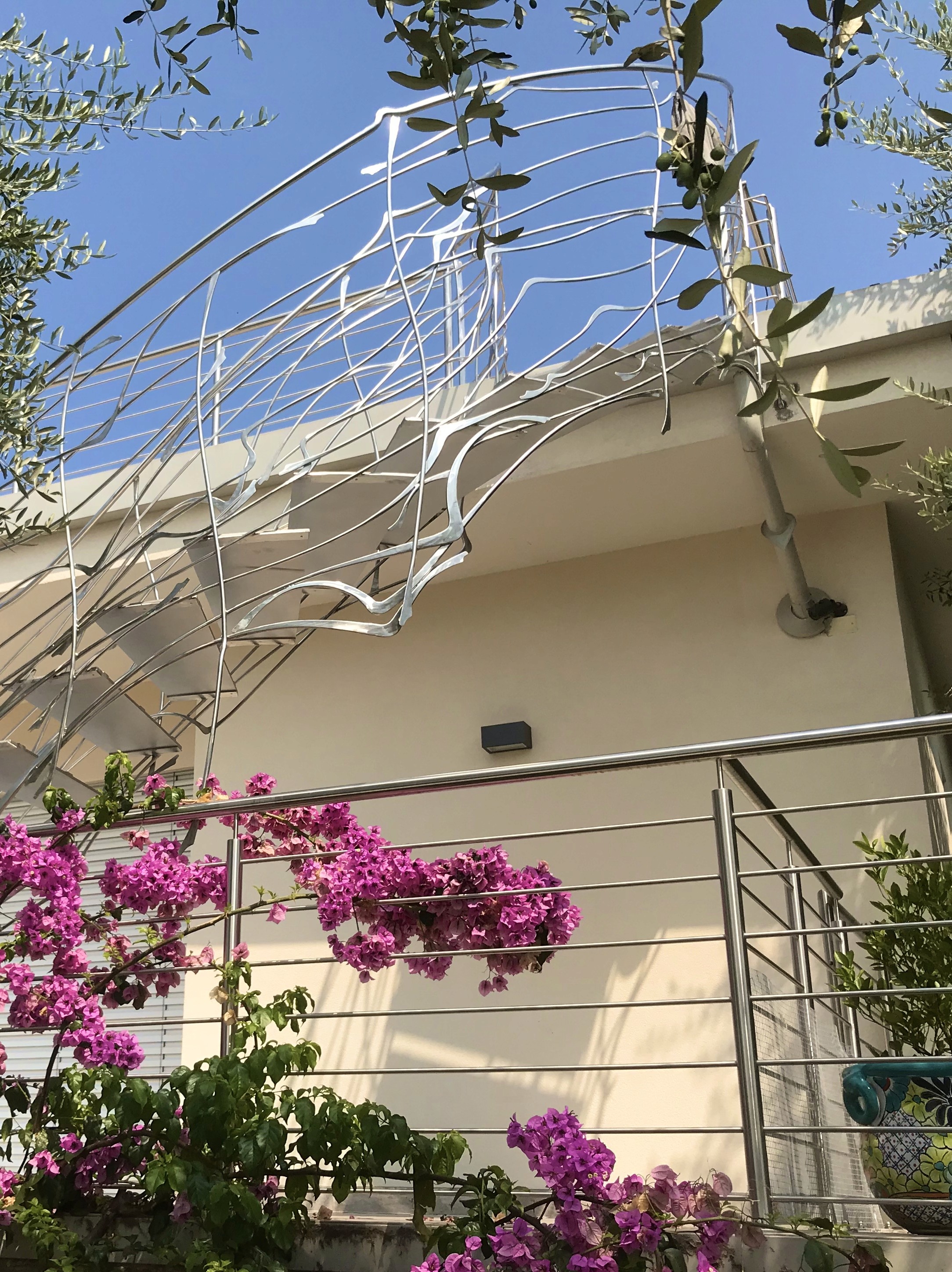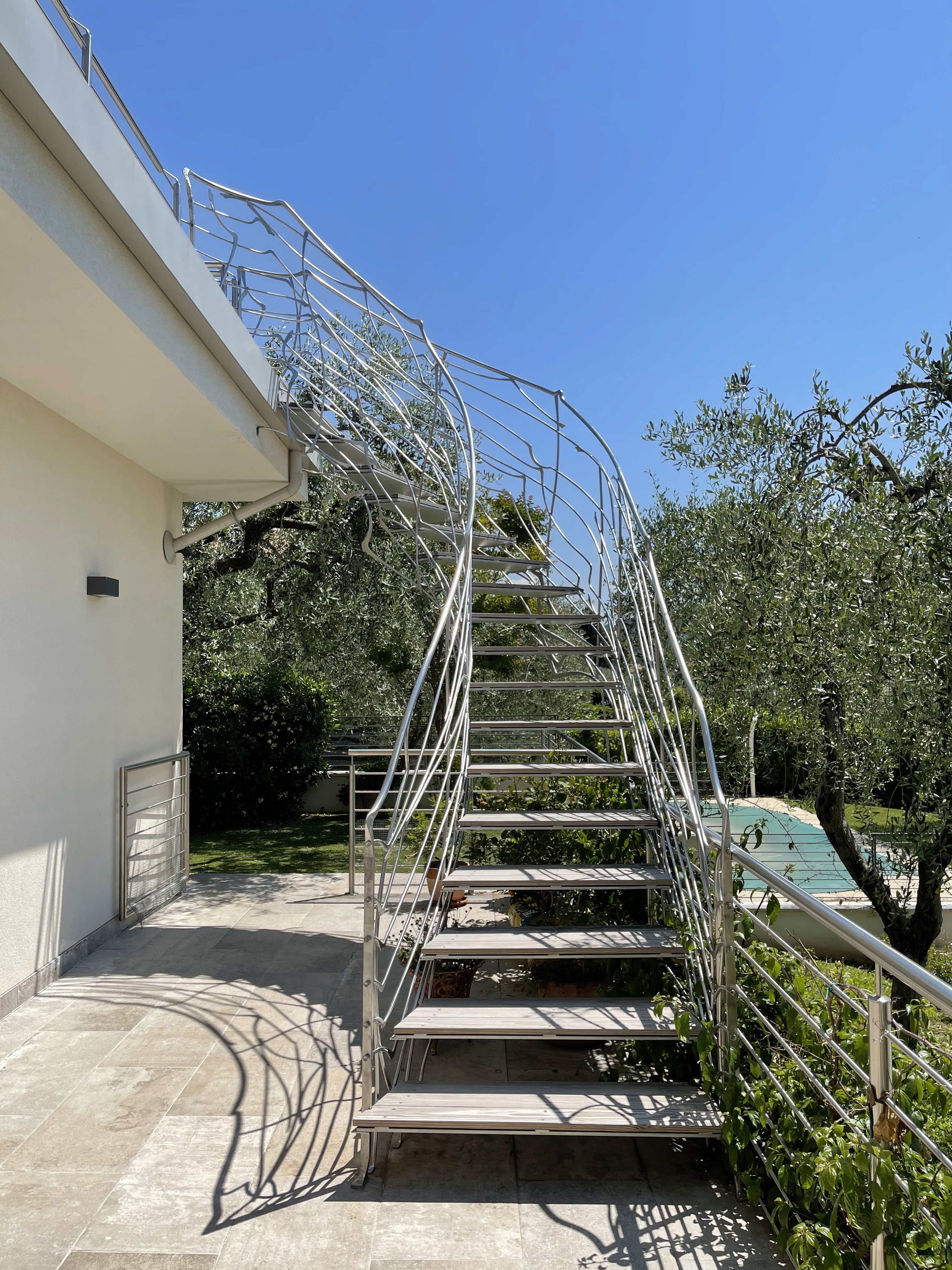 The design of the staircase was therefore conceived as an element growing from the garden up to the terrace, evoking the idea of plants naturally climbing along the architecture. To meet these requirements, stainless steel was selected, a material particularly suited for fully outdoor use, ensuring durability and long-term performance without compromise.