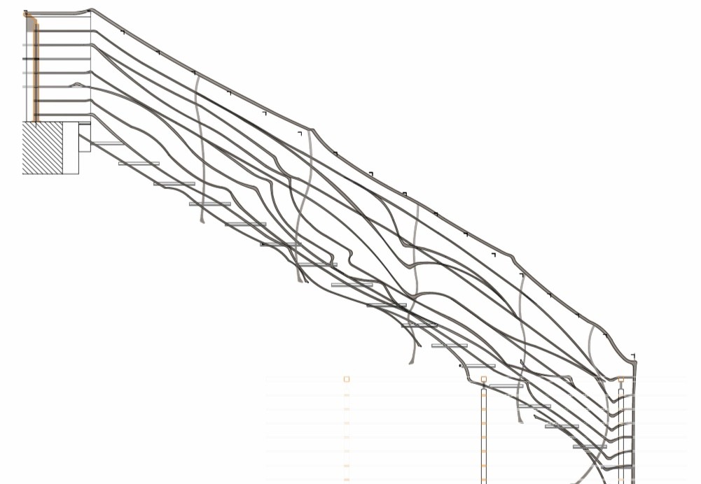 The technical uniqueness of this staircase lies in a carefully balanced combination of materials, selected according to their specific properties. The load-bearing structure is made of forged stainless steel, ensuring strength and durability in an outdoor environment.